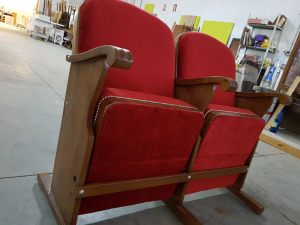 Restauración de butacas de cine realizada por La Buhardilla Mobiliario dedicada a la resturación de muebles en sus instalaciones de Almoradi y dando servicio a la Vega Baja, Elche, Alicante y provincia de Murcia.
